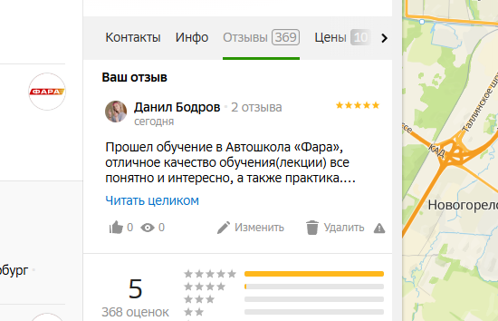 В автошколу Фара (филиал Мурино) пошла по рекомендации подруги и совсем не пожалела.Теорию преподавали очень доступно, с разъяснением, а не просто лекционным материалом. Инструктор, Степанов Дмитрий Сергеевич, терпеливо и доходчиво обучал вождению. Хочу отдельно поблагодарить его за терпение и непринужденную обстановку на занятиях, что немаловажно, т.к. всегда на нервах на первых занятиях, но когда рядом спокойный, уравновешенный, готовый объяснять по несколько раз инструктор, то и сама успокаиваешься и чувствуешь себя уверенней. Буду рекомендовать вашу автошколу. Спасибо!