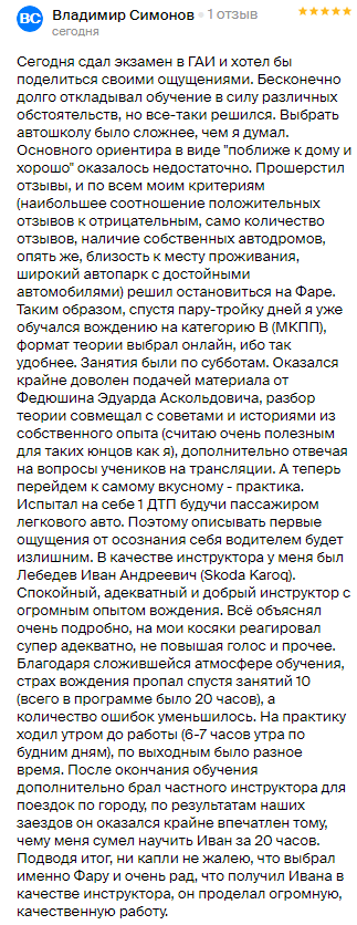 Обучаюсь в «Фаре» на Парнасе!Очень рада, что выбрала эту школу, здесь учились мои знакомые, они тоже очень довольны были!!Теорию объясняли доступно и понятно, можно было всегда посмотреть запись занятия, что очень удобно.Практические занятия вызывают очень много положительных эмоций.У меня был инструктор - Николай Владимирович Тюков.Во-первых, страх вождения пропал сразу после первого занятия.Большой опыт инструктора и позитивный настрой от него дают большой стимул.Спустя примерно 8-10 часов занятий, я себя чувствую уверенно в рулём, при любых обстоятельствах на дороге. За это отдельное спасибо Николаю Владимировичу