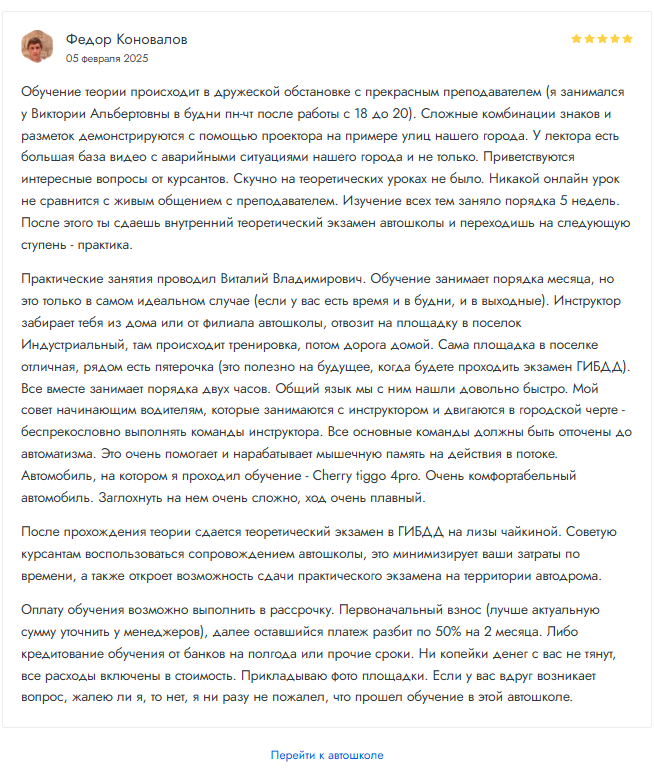 Очень рад что выбрал данную автошколу.Хочу выразить благодарность инструктору по вождению Виталию , всё очень доходчиво объяснял , на дороге стал чувствовать себя намного увереннее .Так же преподавателю по теории тоже хочу выразить благодарность, каждую тему подробно разбирали , занятия шли без какой-либо спешки.И конечно же горячая линия автошколы которая всегда была на связи и тоже отвечала на все интересующие вопросы.