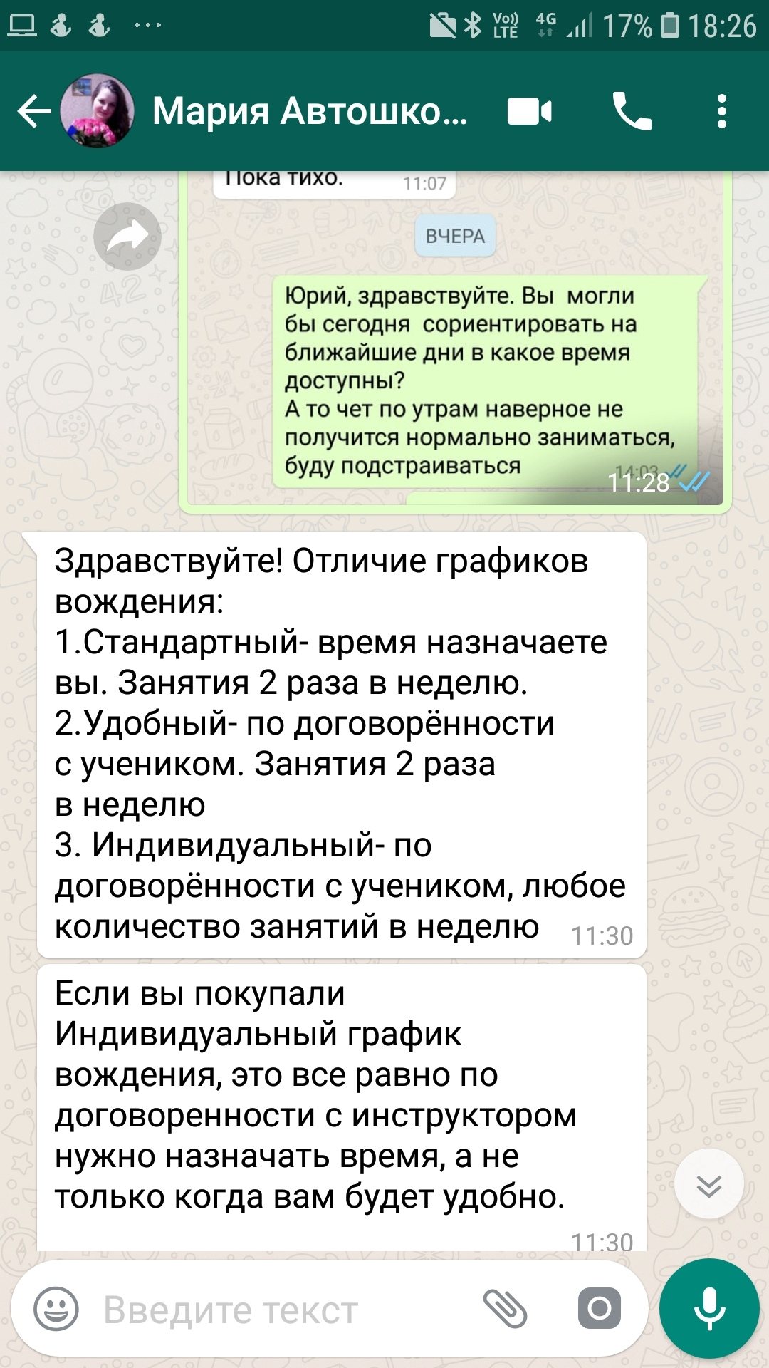 Если вы оплатили тариф удобный, индивидуальный и так далее - забудьте. В договоре написано, что у вас есть право выбрать определенное кол-во занятий и устанавливать время этих занятий. Поправочка: "ПО ДОГОВОРЕННОСТИ С ИНСТРУКТОРОМ". Для инструктора вы ученик автошколы, а не индивидуальный заказчик, он с вас имеет ровно в 2 раза меньше. Поэтому заниматься вы будете тогда, когда ему будет удобно. Я оплатил тариф индивидуальный, по факту инструктор мне сказал, что не чаще 2 раз в месяц будут занятия (скрин во вложении). А менеджер автошколы сказала, что плевать на мой индивидуальный тариф, все по договоренности с инструктором (скрин во вложении).