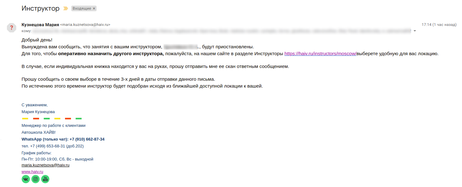 Если вы нашли инструктора на карте на сайте автошколы и уже думаете, как вам удобно будет добираться до места встречи - забудьте. Инструкторы данной автошколой недовольны и часто ее покидают. Скорее всего так было и с моим инструктором и инструкторами моих знакомых. Приходит письмо на почту, которую я прикладываю во вложении. Я вместо желаемых 10 минут в любое удобное для себя время по графику в итоге буду ездить почти час, когда захочет инструктор. Из-за этого проблемы на работе. Поэтому учитывайте это все!