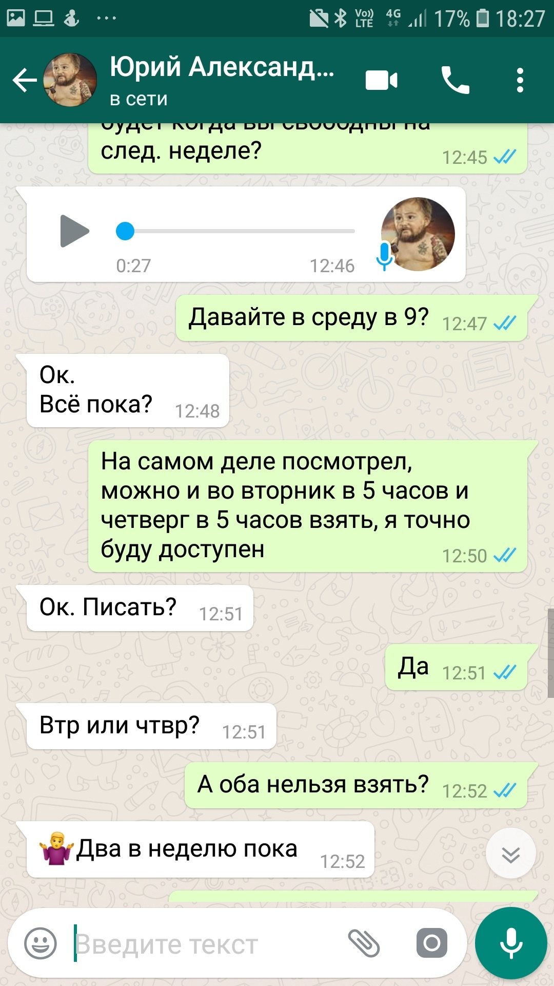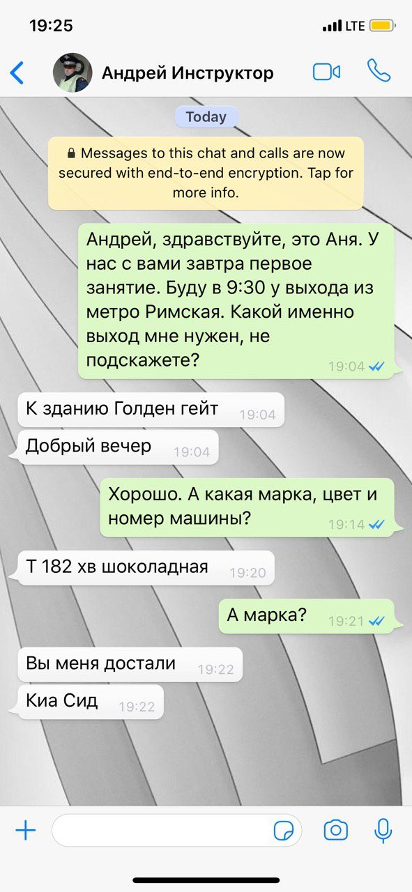 С третьим инструктором мы не успели даже дойти до занятий. Сначала он обхамил меня по телефону, затем накануне первого занятия обхамил меня в переписке, заявив, что я его достала. (Скриншот прилагается). Помимо этого он заявлял, что заниматься по вечерам не будет - тоько за отдельную плату - 1500 рублей непосредственно ему в карман после каждого урока. Имя инструктора - Касько Андрей Сергеевич.