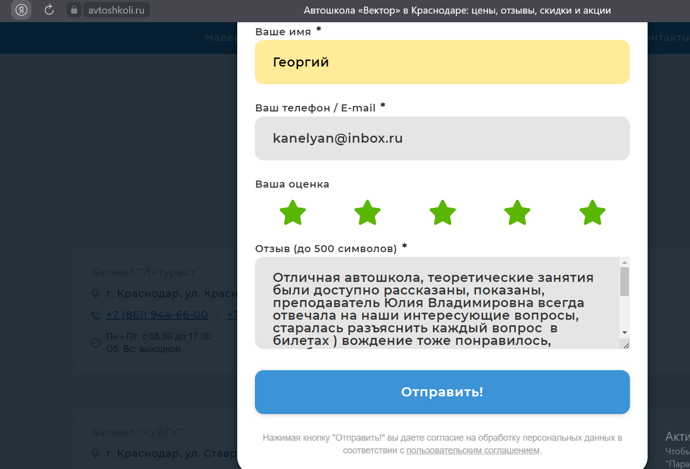 Хочу сказать спасибо автошколе вектор за возможность иметь права и ездить на машине. Отдельнуюблагодарность хочу выразить самому лучшему инструктору Михаилу. Такого терпения нужно еще поискатьБуду очень скучать по его веселым шуточкам и нашим душевным разговорам во время занятий.Благодаря его обучению, вере в меня и поддержке я сдала экзамен с первого раза,так же хочется отметить работу преподавателей и лекции по ДТП. слушала на одном дыхании и впитывала информацию