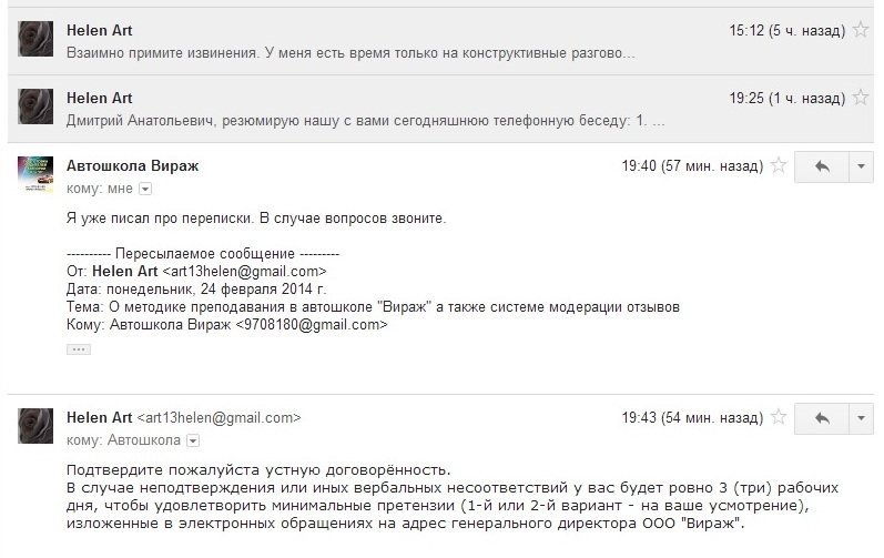 У нас имеется банковское подтверждение первого платежа на 3900 руб. за август 2013 года. Все остальные платежи из общей суммы заплаченных на обучение 25200 руб. были приняты в виде наличных средств сотрудниками ООО "Вираж" и подтверждаются косвенно только датами 4-х не сданных дочерью экзаменов в ГИБДД - наличием её данных в списках от автошколы "Вираж" за 09.12.2013, 30.12.2013, 18.01.2014 и 16.02.2014. О легальности сданного ею внутришкольного экзамена мной уже сделан официальный запрос, который принят с присвоением идентификатора 78-3419 и отправлен в Управление ГИБДД ГУ МВД России по Санкт-Петербургу и Ленинградской области