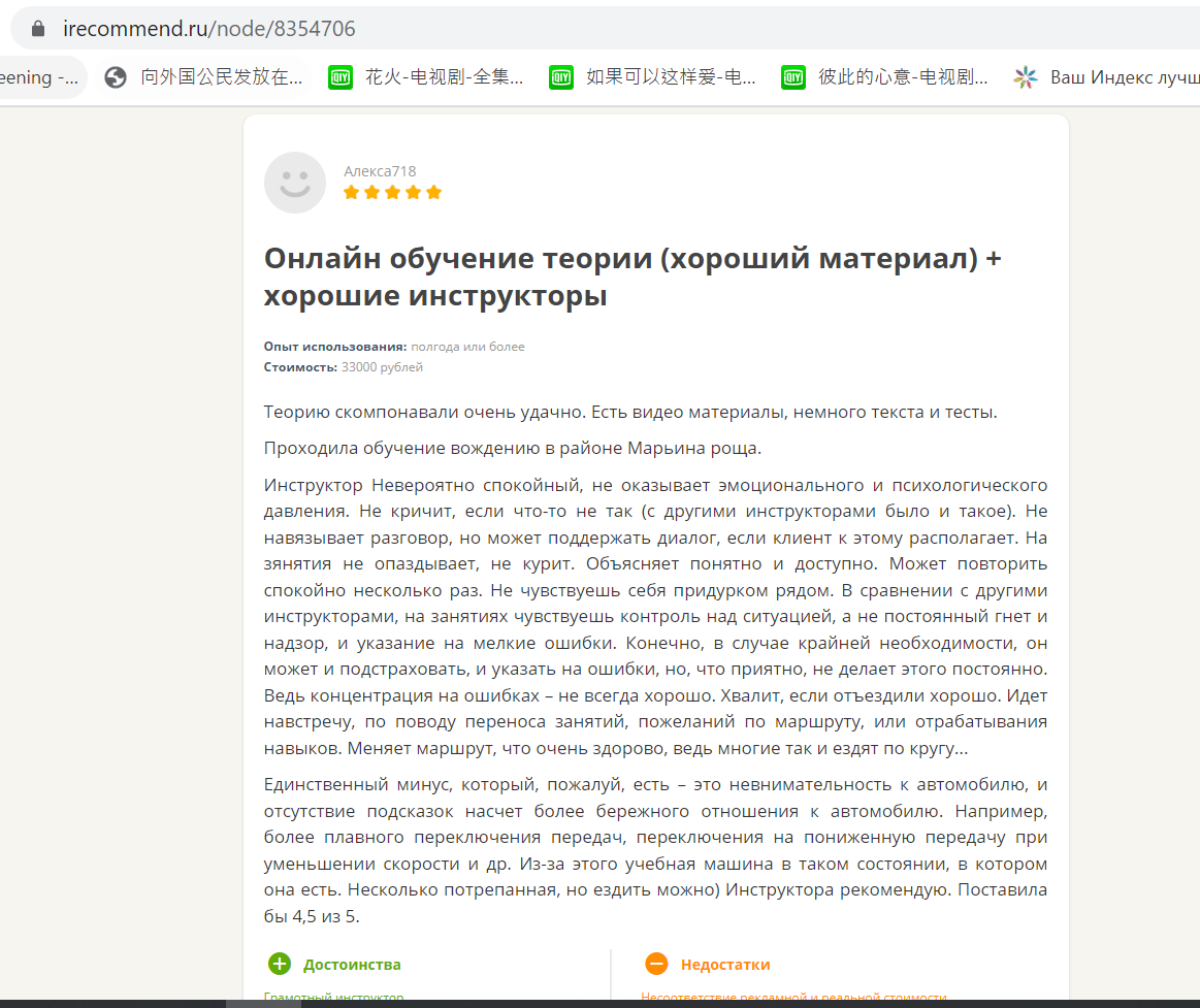 Хорошо структурирован материал по теории. Есть видео лекции, минимум текста, и тест по каждой теме. (Онлайн-обучение построено на площадке Автошколы Онлайн) Занималась вождением с инструктором Чучиным Сергеем. Он невероятно спокойный, не оказывает эмоционального ипсихологического давления. Не кричит, если что-то не так (с другими инструкторами было и такое). Не навязывает разговор, но может поддержать диалог, если клиент к этому располагает. На зянятия не опаздывает, не курит. Объясняет понятно и доступно. Может повторить спокойно несколько раз. Не чувствуешь себя придурком рядом. В сравнении с другими инструкторами, на занятиях чувствуешь контроль над ситуацией, а не постоянный гнет и надзор, и указание на мелкие ошибки. Конечно, в случае крайнейнеобходимости, он может и подстраховать, и указать на ошибки, но, что приятно, не делает этого постоянно. Ведь концентрация на ошибках – не всегда хорошо. Хвалит, если отъездили хорошо. Идет навстречу, по поводу переноса занятий, пожеланий по маршруту, или отрабатывания навыков. Меняет маршрут, что очень здорово, ведь многие так и ездят по кругу...
