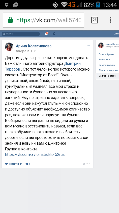 Дорогие друзья, разрешите порекомендовать Вам отличного автоинструктора Дмитрий Тараров . Это тот челочек про которого можно сказать "Инструктор от Бога!". Очень деликатный, спокойный, тактичный, пунктуальный! Развеял все мои страхи и неуверенности буквально за несколько занятий. Ему не страшно задавать вопросы, даже если они кажутся глупыми, он спокойно и доступно объяснит необходимое количество раз, покажет сам или нарисует на бумаге.