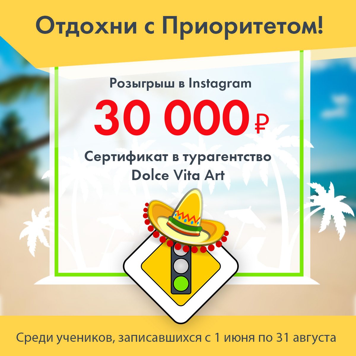 Автошкола Приоритет совместно с турагентством Dolce Vita Art объявляет Сторис-розыгрыш в Instagram. Сертификат на сумму 30000 рублей будет разыгран среди учеников, записавшихся с 1 июня по 31 августа и выполнивших условия конкурса. Подробности по телефону 256-57-59