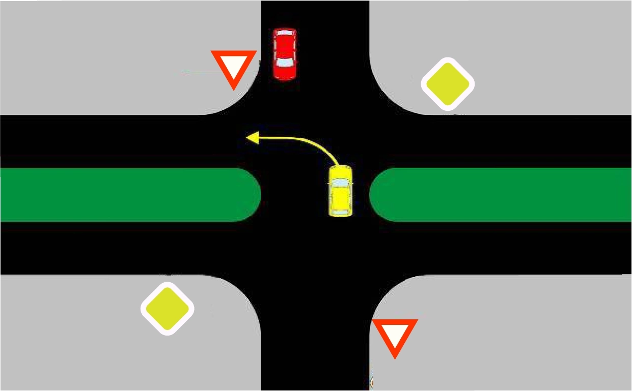 Добрый времени суток. Это очень проблемный перекрёсток в нашем городе. Водители буквально разделились на два лагеря, споря о том, кто должен ехать первый. Будьте добры, рассудите