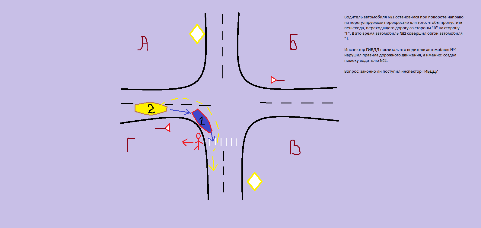Здравствуйте! Мой знакомый сегодня сдавал экзамен в ГИБДД, но не сдал. Причина - создал помеху транспортному средству, едущему сзади. Посмотрите, пожалуйста, схему. Очень надеюсь на Ваш ответ!