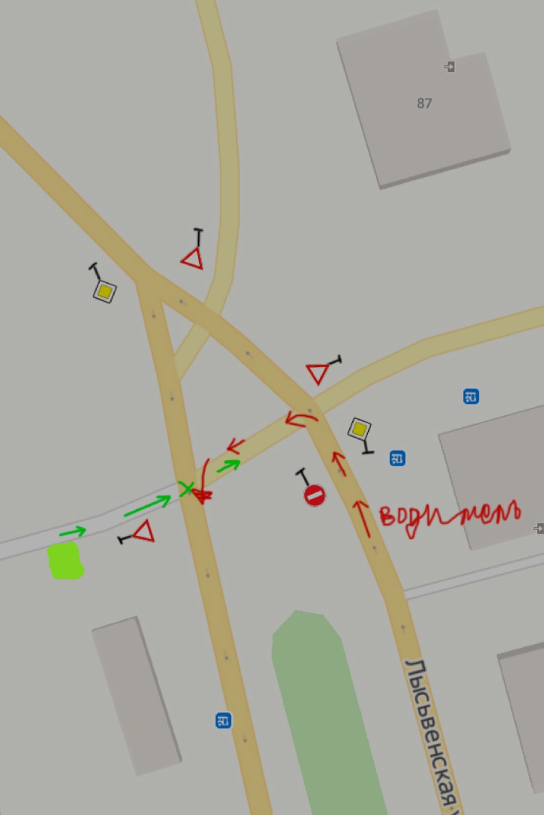 Подскажите, если я продолжу движение по данному перекрёстку прямо в среднем ряду, а водитель из правого ряда решит повернуть налево, кто должен уступить дорогу?
