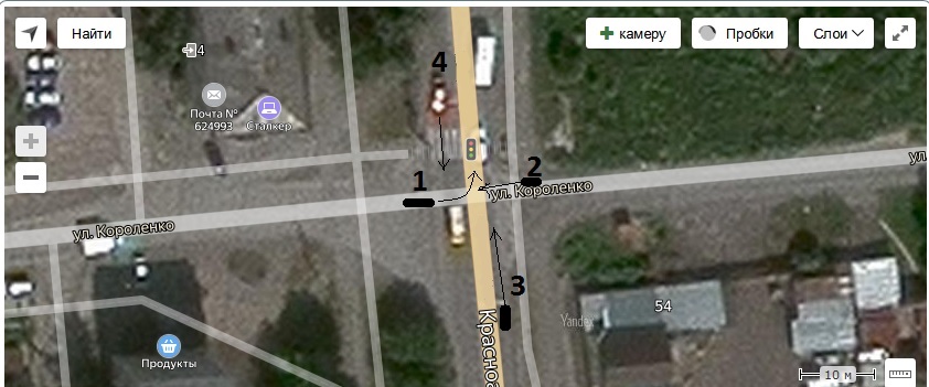 Здравствуйте, на прикрепленном изображении четыре автомобиля и перекресток Красноармейская - Короленко в г.Серове, Свердловской обл.. Как ехать автомобилю №1, если горит зеленый сигнал светофора для главной дороги по ул.Красноармейской, а для ул.Короленко светофор отсутствует, и если автомобиль №2 при этом стоит и не едет, а автомобили №3 и №4 еще далеко?