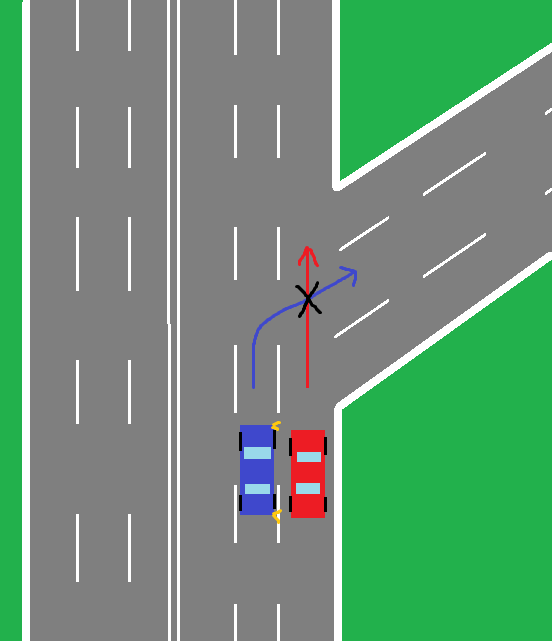 Добрый день, вопрос такой, при развилке многополосной дороги (см.рисунок), если нет никаких знаков, то что съезжать можно только с крайней правой, это понятно, но в какую полосу я могу съезжать, только опять же в крайнюю правую, или в любую? И кто будет виноват в случае ДТП, на месте отмеченном крестиком?