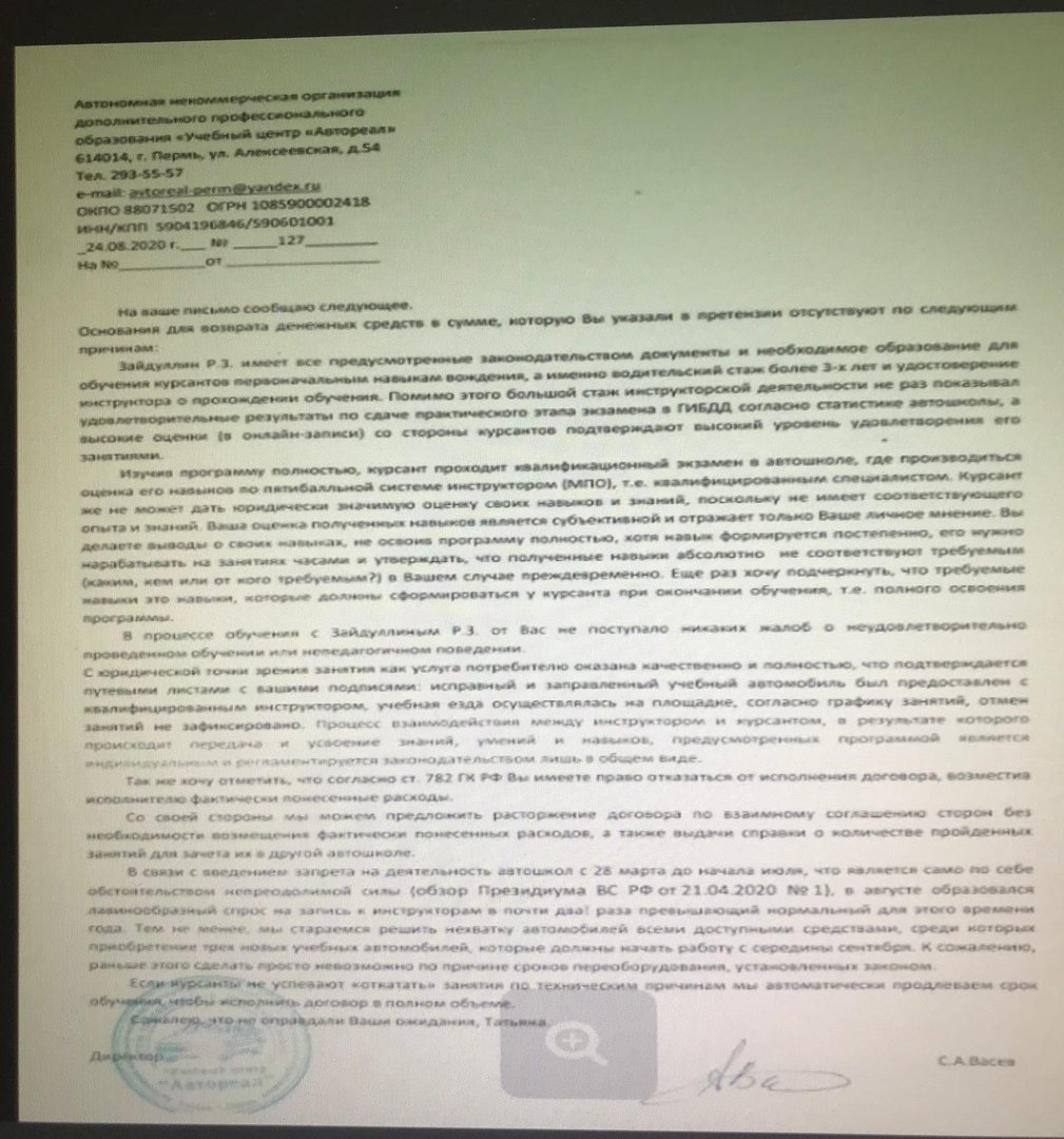 Заключили договор с автошколой на Крупской в июне на обучение. На практику записалась к инструктору Рустаму, во время занятий инструктор допускал разговоры по телефону, часто отвлекался на социальные сети, навопросы все ли верно отвечал "да, все верно", на вопросы о понимании прохождения элемента говорил "думать не надо, за тебя уже все подумали, ориентируйся по фишкам". Спустя несколько занятий первый инструктор ушел в отпуск, и был предложен инструктор Сергей (к другим записаться было невозможно из-за отсутствия свободной записи). На занятиях Сергей комментировал, что все чему научили не так, руль держу не так, поворачиваю не так, на фишки ориентироваться не нужно и т.д. и все это в достаточной грубой форме. Навыков вождения изначально у меня не было, поэтому все делала со слов первого инструктора. На претензию направленную в автошколу руководство ответило, что все инструктора опытные и проходят обучение внутри школы. Со мной, как с обучающимся не связывались, детальной информацией не интересовались. Могу предположить, что это сделано специально с целью увеличения количества часов для прохождения практики. И дополнительно, с записью действительно есть проблемы. К трем инструкторам записываются обучающиеся из десяти групп на обучение. На другом сайте к отзыву написали, что претензии не поступало, хотя ответ был получен. После того, что выяснилось что фирма проводит платежи не официально написали, что готовы вернуть денежные средства, а потом они к возврату в назначенный день испарились))