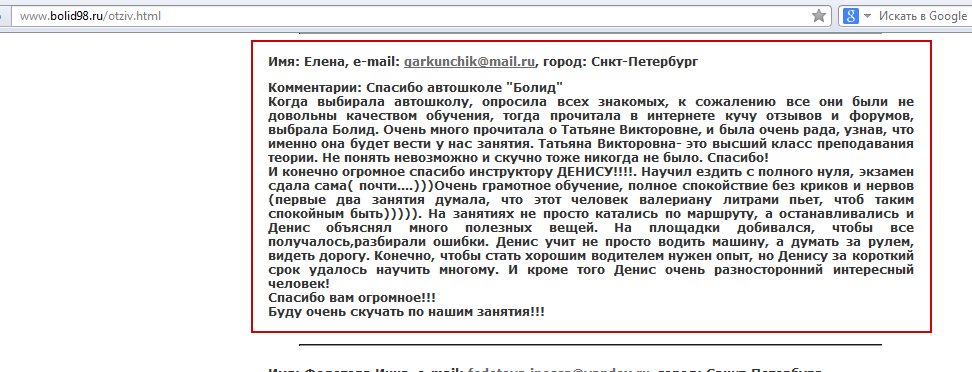 Замечательно конечно, что на этом сайте так много положительных отзывов о данной школе, только вот подбирая школу для своей супруги, я решил основательно изучить мнения людей и начал с наиболее доступного места хранения данной информации - интернета.Читая отзывы на разных сайтах я неоднократно ловил себя на мысли, что я это где-то уже читал, но писал другой человек. И вот как пример: отзыв Полина, 08-01-2013 06:12 на этом сайте полностью идентичен отзыву Марии от 08 Января 2013 на сайте http://www.gazeta-a.ru/uslugi/spb/avtoshkoli_spb/bolid_na_prlesnoi/