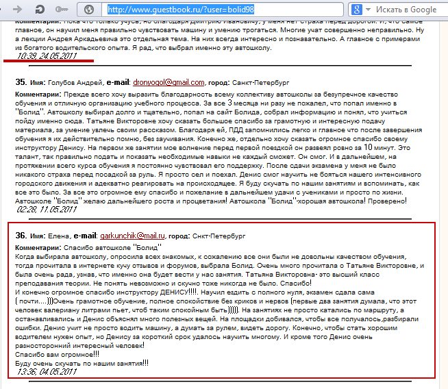 Этот отзыв написан 4 апреля 2011 года еще в нашу старую гостевую книгу http://www.guestbook.ru/?user=bolid98 номер отзыва 36. К отзыву прилагается адрес почты, кто не верит может написать, я думаю человек ответит.