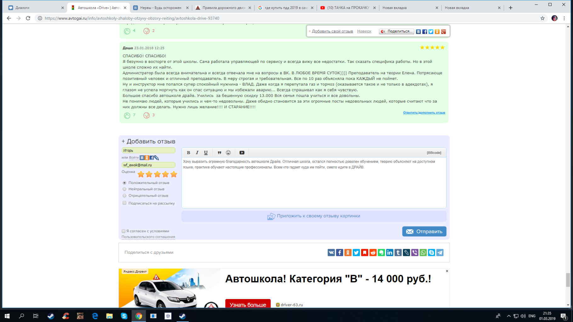 Пошла по рекомендациям друзей...и не прогадала. Отличная школа с громким именем "Драйв". Действительно административная работа на высшем уровне, теория и практика в не всяких похвал, разжевали и положили в рот))) Как после этого люди говорят что не сдают...я просто не понимаю. Успехов Вам и терпения, ведь сколько людей столько и мнений. Спасибо Вам большое.