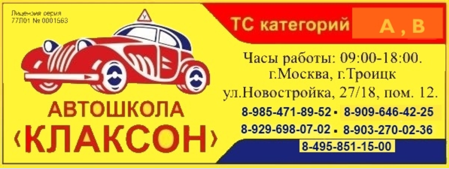 Автошкола «Клаксон» в Москве ул. Новостройка, 27/18, пом. 12 Тел.:8-903-270-02-36, 8-909-646-42-25, 8-920-878-73-46, 8(495)851-15-00