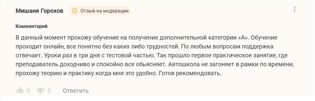 В данный момент прохожу обучение на получение дополнительной категории "А". Обучение проходит онлайн, все понятно без каких либо трудностей. По любым вопросам поддержка отвечает. Уроки раз в три дня с тестовой частью. Так прошло первое практическое занятие, где преподаватель доходчиво и спокойно все обьясняет. Автошкола не загоняет в рамки по времени, прохожу теорию и практику когда мне это удобно. Готов рекомендовать.