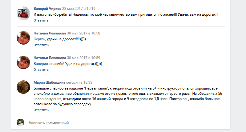 Спасибо автошкола ''Первая миля'' за отличную подготовку. Евгении огромное спасибо за теоретические знания))) объяснила все доступно и понятно))) огромное спасибо инструктору Дмитрию Пескишеву за терпение и моральную поддержку на практическом экзамене. Отличная автошкола. Всем советую))
