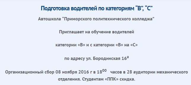 Автошкола “Приморского политехнического колледжа” предлагает свои услуги по обучению на категории “В”, “С” и “С1”