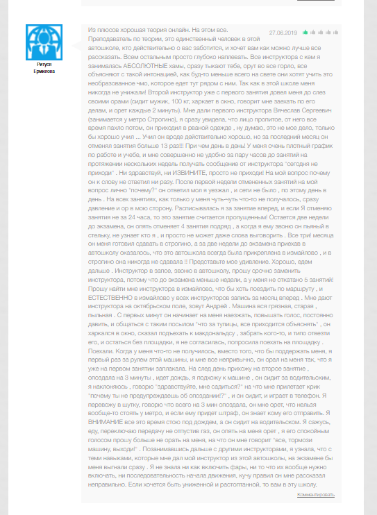 Тест отзыва был скопирован из данного источника: https://llike.ru/moscow/avtoshkola_hayv, отзыв был оставлен 27.06.2019 в отношении автошколы "Хайв", город Москва.