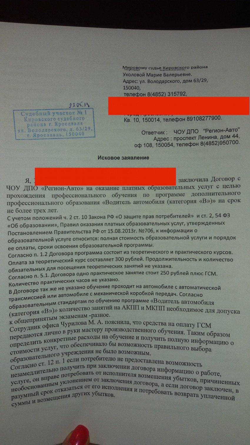 Местоположение пользователя: Россия, Москва Света, можете в Ленинский подавать иск на признание нескольких пунктов договора или сам договор в целом не действительным -это во первых, во вторых не качественные образовательные услуги. Мое дело будет в Кировский районном рассматриваться, куда было передано по подсудности. И я не первая такая, после подачи не малого количества исков автошколе стало выгоднее закрыться. Юридически регион-авто еще существует. Вам может свидетель нужен? Мой телефон в заголовке иска. Есть заключение проверки из ГИБДД, которое вас может заинтересовать.