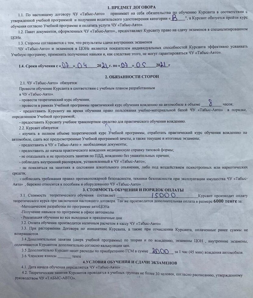 В договоре указано про 8 часов вождения. Я всё откатал, дело дошло до окончания автошколы, и тут директор всем заявляет, что никому документы не выдаст пока мы не прокатаем 50 часов ( а вождение дорогое), начала обманывать про какую-то программу обучения и прочее. Я позвонил в Департамент полиции Карагандинской области, они сказали что программы одни для всех разрабатывает МВД, и порекомендовали написать заявление в полицию.