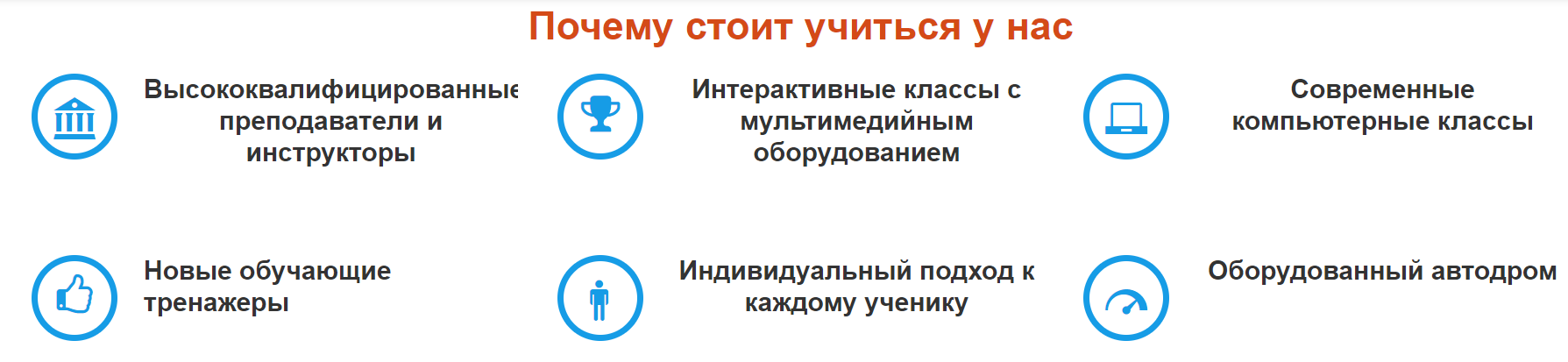 Обучение у нас проводится по государственной программе высококвалифицированными преподавателями и мастерами производственного обучения вождению. Учебные классы оборудованы техническими и мультимедийными средствами обучения, в компьютерных классах установлено программное обеспечение, аналогичное для сдачи теоретического экзамена в ГИБДД. Центр располагает тремя учебными площадками, на которых отрабатываются практические навыки управления автомобилем и производится прием практического экзамена ГИБДД
