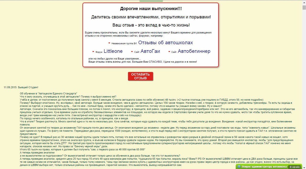 Местоположение пользователя: Россия, Санкт-Петербург Не очень уважаемый, потому что не осмелился представиться, а информацию обвинительного характера нехорошо писать анонимно. Ещё не очень уважаемый потому, что не очень качественно скопировал этот текст откуда-то, о чем свидетельствует специальные символы в начале в конце. И очень рьяно разместил его везде, куда только ручки дотянулись. Хотя сомнения по поводу того, имеет ли автор реальное отношение к выпускникам школы весьма большие, т.к. по описанным ситуациям нам установить личность не удалось, т.к. ни у одной группы НИКОГДА не бывает таких перерывов. Другой конкретики не увидели...Об остальном: жаль, что автор ошибся в выборе автошколы. И нам, т.к. он такое пишет и ему жаль, деньги ушли за занятия и попытку привить навыки и знания, а ему надо было быстро и ни к чему честно. Сам автор пишет то де, что и мы на сайте: на площадку ездим много, учим не "цирковому" исполнению упражнений на экзамене, а намного бОльшему, что поможет уметь делать гораздо более сложные маневры, задний ход, руление, ориентация в пространстве и в узких проездах и т.д. Так же техника руление необходима, но автора раздражали тренажеры. Накат по спальным районам. Да там такое движение, перекрестки, круговые площади, трамваи, пешеходы... А где ещё? В центре стоять в пробках? На КАДе, где запрещено?Да и экзамен ГИБДД по такому же району проходит. Выдали программу полностью - что за гадостная школа...Завал группы на развороте через разрыв сплошной - ложь!!! Просто вранье! Сдало 5 из 30 - такая же ложь для непосвященных. Готовы предоставить протоколы. Вопрос зачем кому-то обливать нас грязью? Ответ прост - ближайшие школки, рекламирующиеся, как "Всё супер за 25"...