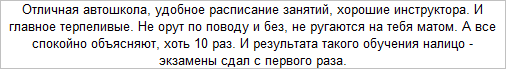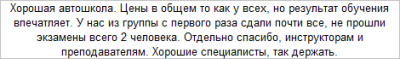 [td]Хорошая автошкола. Цены в общем то как у всех, но результат обучения впечатляет. У нас из группы с первого раза сдали почти все, не прошли экзамены всего 2 человека. Отдельно спасибо, инструкторам и преподавателям. Хорошие