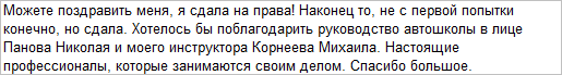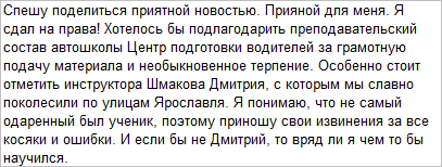 [td]Спешу поделиться приятной новостью. Приятной для меня. Я сдал на права! Хотелось бы поблагодарить преподавательский состав автошколы Центр подготовки водителей за грамотную подачу материала и необыкновенное терпение. Особенно стоит отметить инструктора Шмакова Дмитрия, с которым мы славно поколесили по улицам Ярославля. Я понимаю, что не самый одаренный был ученик, поэтому приношу свои извинения за все косяки и ошибки. И если бы не Дмитрий, то вряд ли я чем то бы научился.
