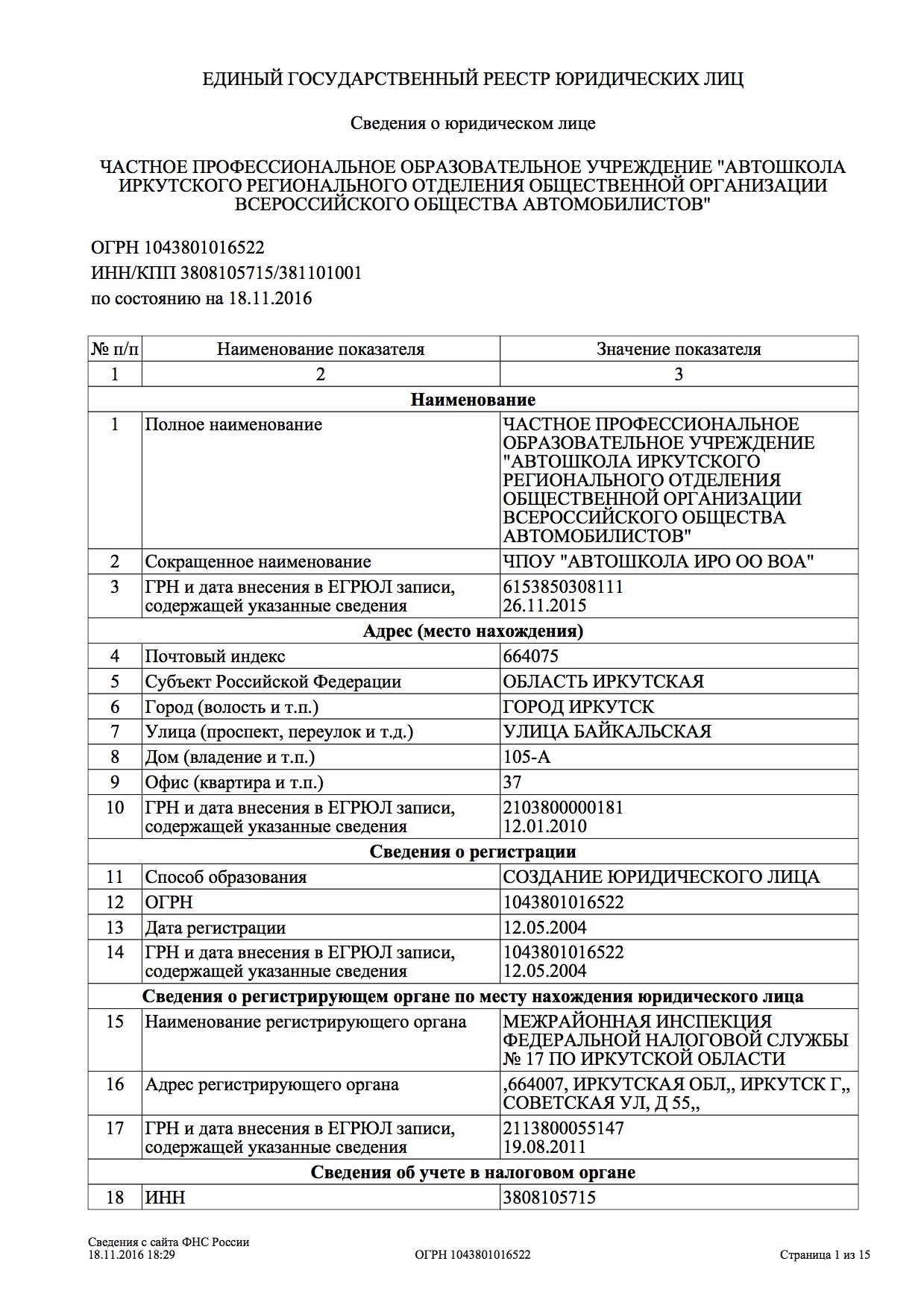 Уважаемые будущие автомобилисты! Данная автошкола никакого отношения к Всероссийскому обществу автомобилистов не имеет. Более того, у автошколы явно большие проблемы с регистрационными документами. На сайте школы в разделе о компании написано, что "Учредителем автошколы является Иркутское региональное отделение Общественной организации Всероссийского общества автомобилистов", при этом открываем по ее ИНН 3808105715 выписку налоговой и видим, что учредитель -