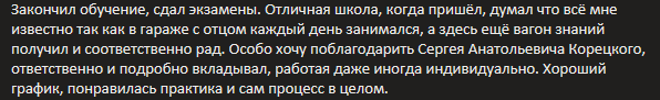 В общем не пожалел, что проходил обучение в автошколе. Долго подбирал себе какую именно выбрать и остановился именно на этой, по цене недорого в районе 25000, грамотные преподаватели, теорию нам преподавала Наталья Петровна Алексеева, к экзамену подготовили основательно и я сдал всё с первого раза не напрягаясь. Благодарю за ответственный подход к обучению.