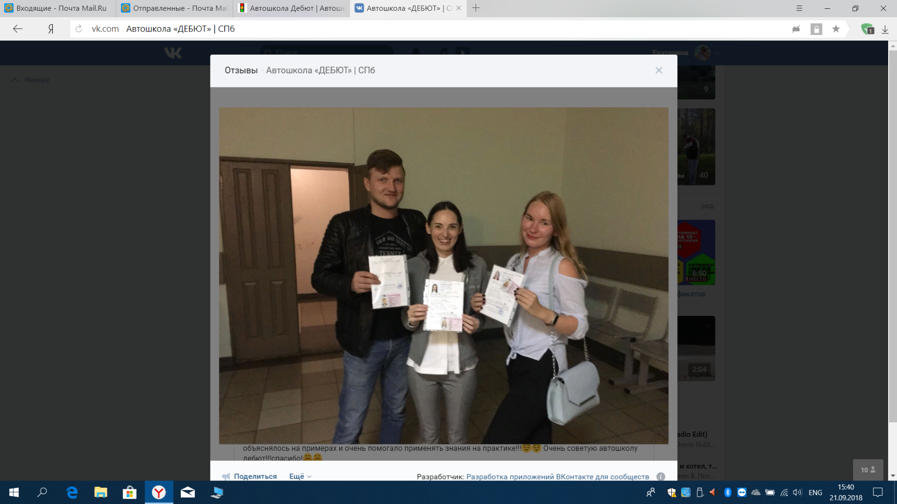 22 сентября получил права! Автошкола Дебют - просто супер! Теория на Пионерской у Алексея Алексеевича проходила на одном дыхании. Вождение с Захаром просто улёт! Я конечно что-то умел раньше, но уверенности не было и много оказывается не знал. Спасибо всем, кто работает в этой автошколе! На экзаменах с вами было не страшно!!! Встретимся теперь на дороге!!!