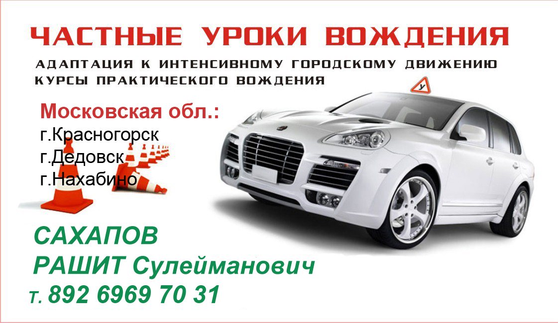 Частные уроки мастерства вождения:• для новичков - полный курс вождения+ теория;• отдельным элементам вождения (парковка, движение задним ходом, приемы контравариантного вождения и многое другое);• адаптация к активному городскому движению;• адаптация управления новым автомобилем или после длительного перерыва вождения;• адаптация к вождению в сложных условиях (зимние условия, пересеченная местность).Все практические курсы сопровождаются попутным повторением правил дорожного движения.Условия: • Регион обучения Московская область, г. Красногорск, г. Дедовск, г. Нахабино;• Первое занятие скидка 20%. После первых занятий определим на какие элементы вождения нужно обратить особое внимание и сколько времени Вам понадобиться для самостоятельного вождения.Бонусы:• Вы можете выбирать маршрут (дом-работа-школа-торговый комплекс и т.д.);• Заключительные занятия проводятся на Вашем автомобиле.Предварительная запись за 3 дня по телефонам:• 892 6969 70 31• 896 5196 83 45Ваш инструктор Рашит Сулейманович