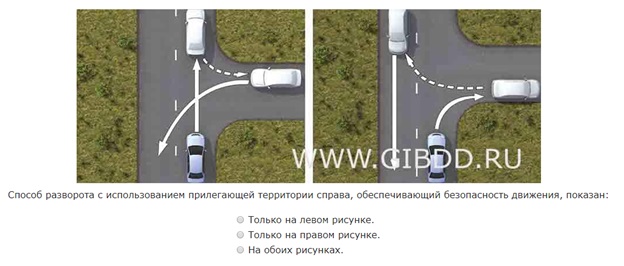 Правильный разворот на узкой дороге с использованием прилегающей справа территории изображен на рисунке слева, так как двигаясь задним ходом вы сможете контролировать и траекторию движения, и ситуацию на полосе, на которую въезжаете.