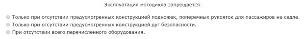 Согласно пунктам 7.16 и 7.17 Перечня, эксплуатировать мотоцикл нельзя, если на нем отсутствуют предусмотренные конструкцией дуги безопасности, подножки, поперечные рукоятки для пассажиров на седле.
