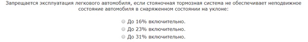 Согласно пункту 1.5 Перечня, вам запрещено эксплуатировать транспорт, если его стояночной системой не обеспечивается неподвижное состояние легкового авто или автобуса в снаряженном виде на уклоне до 23% включительно.