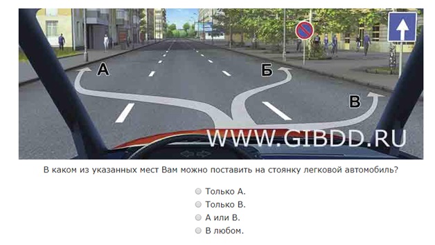 Данная дорога имеет одностороннее движение, а согласно пункта 12.1 ПДД, в населенном пункте на дороге с односторонним движением вы можете поставить авто на стоянку как справа, так и слева у края проезжей части (позиции А и В). Позиция Б не годится для стоянки, поскольку там стоит знак «Стоянка запрещена».