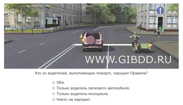 Пунктом 1.3 Правил оговорена обязанность водителей исполнять требования, предписываемые сигналами светофора, дорожными знаками и разметкой. На нашем рисунке мы видим знак 4.1.1, предписывающий двигаться только прямо, и его действие не отменяется сигналом светофора, так как он отменяет действие только знаков приоритета (п. 6.15 Правил). Следовательно, нарушителями являются оба водителя – вариант 1.