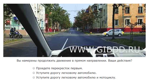И так, перед нами перекресток равнозначных дорог, и, следовательно, на нем действует правило пункта 13.11, согласно которому безрельсовый транспорт уступает дорогу транспорту, приближающемуся справа. Таким образом, вы должны пропустить легковое авто справа, а вот перед мотоциклом преимущество у вас.