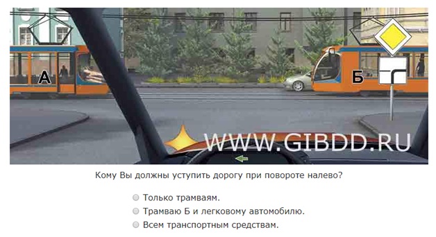 На данном вопросе перед нами предстал сложный перекресток неравнозначных дорог, о чем оповещают знаки 2.1 «Главная дорога» и 8.3 «Направление главной дороги». Как и вы, на главной дороге находятся еще два транспортных средства – легковое авто и трамвай Б, и с ними вы разъезжаетесь по правилу проезда перекрестков равнозначных дорог, то есть, руководствуясь пунктом 13.11, пропускаете трамвай Б, так как у него преимущество перед безрельсовыми ТС, и легковое авто, так как для вас оно – помеха справа. А что касается трамвая А – он на второстепенной дороге, и обязан пропустить вас (п. 13.9-13.11 ПДД).