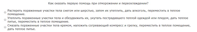 В случае переохлаждения и обморожения пострадавшего важно снизить потерю тепла с поверхности тела, для чего пораженные участки следует обездвижить, утеплить, укутать в плед или теплую одежду. Дайте пострадавшему теплое питье и поместите его в теплое помещение. Алкогольные напитки на морозе давать нельзя, так как они расширят сосуды кожи, и отдача тепла организмом усилится (п. 8.12 Перечня мероприятий).