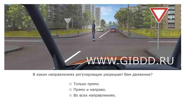 Установленный знак приоритета 2.4 «Уступите дорогу» в данном случае не действует, так как регулировщик определяет очередность движения на данном перекрестке.