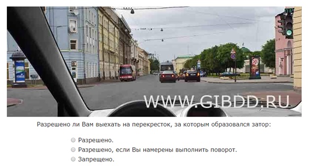 Если сигнал светофора разрешающий, вам не запрещено развернуться или совершить поворот на данном перекрестке. Прямо двигаться вы не можете, поскольку там затор, который вынудит вас совершить остановку, а когда сигналы светофора сменятся, вы создадите помехи движению другого транспорта (п. 13.2 Правил).