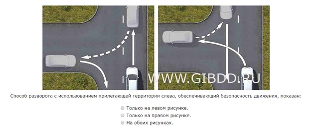 Правильно и безопасно будет развернуться на узкой дороге с использованием прилегающей территории слева так, как показано на рисунке справа, поскольку, при выезде задним ходом на дорогу, водитель сможет следить и за своей траекторией движения, и за обстановкой на полосе, на которую он выезжает.