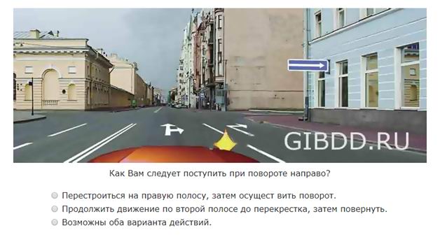 Теперь смотрим на картинку вопроса: стрелки разметки говорят нам о том, что на этом перекрестке разрешено повернуть направо и с правой, и с левой полосы. А это значит, что оба варианта предложенных действий правильны, и верный ответ 3 «Возможны оба варианта действий».