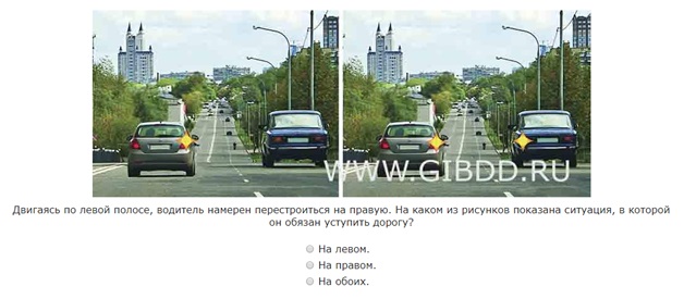 Согласно рисункам, при перестроении с левой полосы на правую, вы уступаете дорогу движущемуся по правой полосе авто, как при неизменном его движении, так и при его одновременном с вами перестроении. Значит, правильным является ответ 3 – «На обоих».