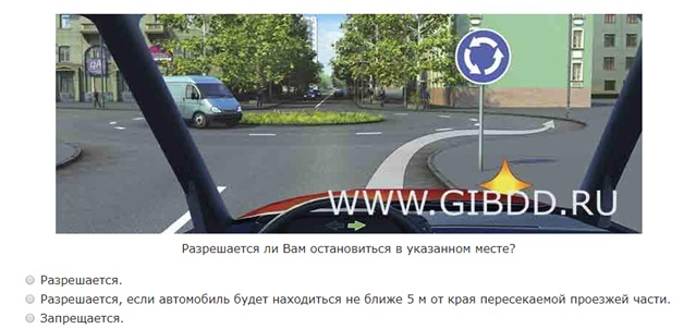 Это значит, что вы можете совершить остановку в данном месте, если встанете не ближе 5 метров от края пересекаемой проезжей части. Верный ответ – 2.