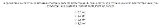 Согласно приложения №1 технического регламента Таможенного Союза «О безопасности колесных ТС», мототранспорт категории L не допускается к эксплуатации с остаточной глубиной рисунка протектора шин не более 0,8 мм. Верный ответ – 1.